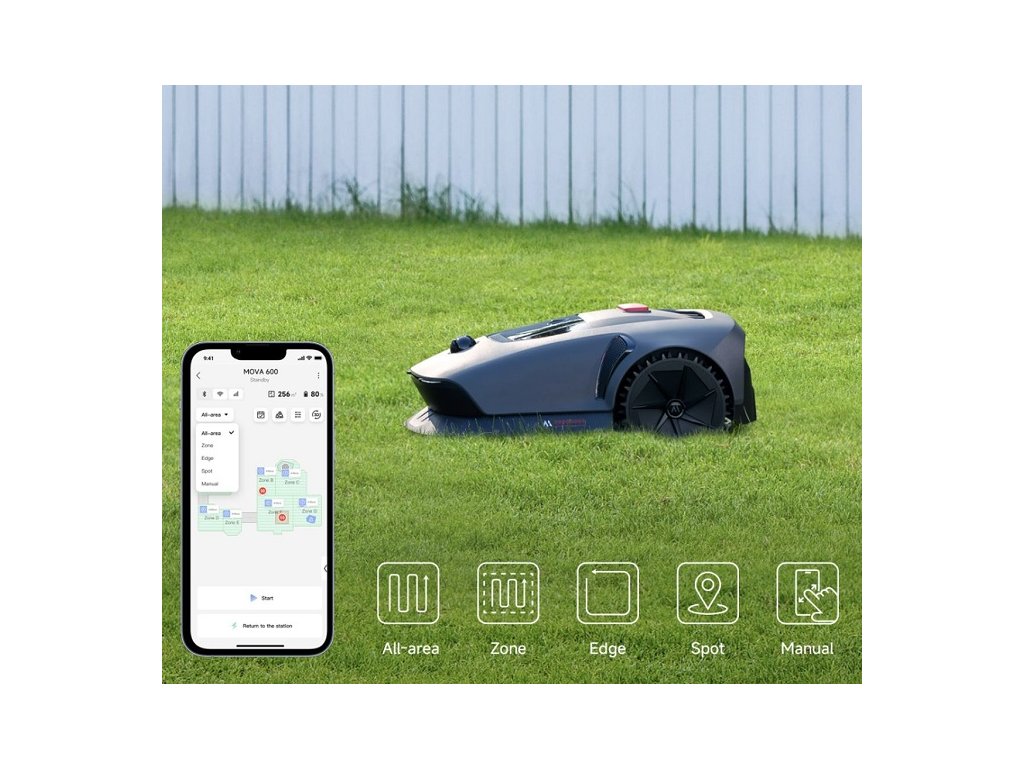 S robotickou sekačkou Mova 600 získáváte plnou kontrolu nad údržbou vaší zahrady prostřednictvím intuitivní mobilní aplikace MOVAHome. Aplikace zobrazuje 3D mapy vytvořené sekačkou a nabízí širokou škálu nastavení, včetně výběru režimů sečení (celoplošné, okrajové, zónové, bodové), úpravy výšky střihu, správy zakázaných zón a možnosti plánování sečení v reálném čase či na později.