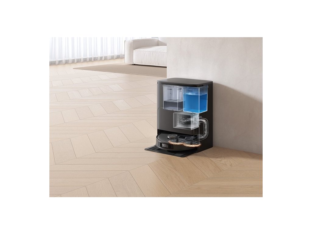 V této sadě je dodávána bezsáčková stanice all-in-one OMNI, v níž se přístroj automaticky vyprazdňuje. To znamená, že se vůbec nemusíte dotýkat prachu, stanici stačí jen jednou za čas vysypat. Po skončení vytírání navíc myje mopy horkou vodou o teplotě 70 °C. Poté je vyždímá a vysuší, čímž pomáhá zachovat maximální hygienu pro každé další použití. OMNI stanice na závěr doplní vodu do robota, čímž ho připraví na další použití, aniž byste museli hnout prstem.