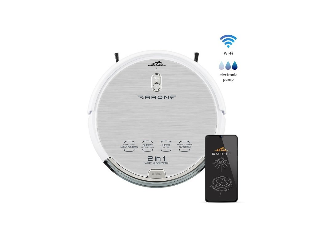 S aplikací ETA SMART můžete vysavač ovládat pomocí mobilního telefonu odkudkoli. Aplikace rozšiřuje možnosti robotického vysavače o některé další funkce a režimy úklidu. Pomocí aplikace naplánujete časy úklidu, nastavíte sací výkon, intenzitu mopování, režim úklidu, kontrolujete stav aktivity vysavače, stav baterie i historii úklidu. V případě potřeby manuálně navedete vysavač. Je kompatibilní s operačními systémy Android 6.0 a novějšími a IOS 9.0 a novějšími.