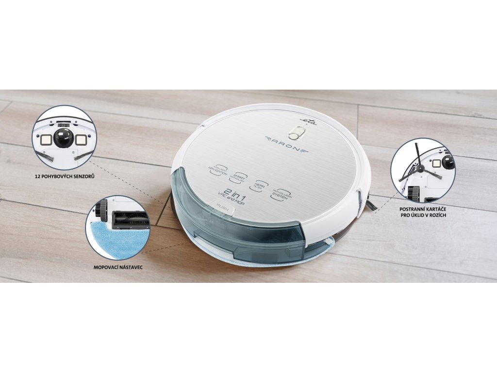 Pokud nechcete věnovat svůj volný čas jen úklidu domácnosti, sáhněte po robotickém vysavači ETA Aron 2 v 1, který vysává i vytírá a je vybaven SMART aplikací. Díky gyroskopické navigaci se dobře orientuje v prostoru a volí optimální trasu pro dosažení efektivního úklidu. Jeho vysoký sací výkon zabezpečuje moderní digitální motor s extra dlouhou životností. Trojnásobná filtrace s HEPA filtrem zachytí i nejmenší nečistoty a prachové částice. Oceníte také jeho dlouhou dobu provozu až 120 minut, během které se bude samostatně věnovat úklidu.