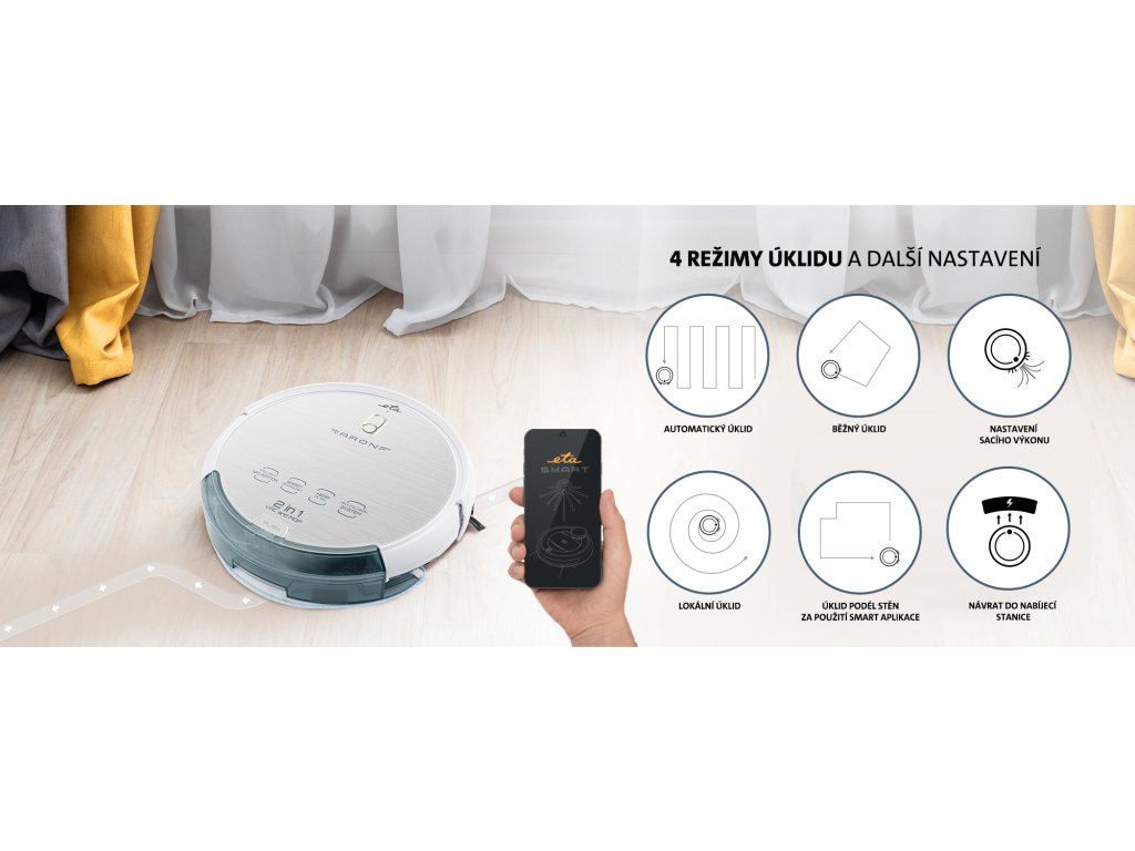 Pro úklid si můžete vybírat ze dvou stupňů sacího výkonu nebo spustit některý ze 4 režimů úklidu. Těmi jsou režim Smart pro automatický úklid, režim Klasik pro běžný úklid, režim Spot pro lokální úklid a režim Edge, který uklidí podél stěn. Tento režim úklidu je dostupný pouze s aplikací ETA SMART. Robotický vysavač jednoduše ovládáte dálkovým ovladačem nebo pomocí chytré aplikace přímo v mobilu. Naplánujte si úklid na jakýkoli čas. Každý den se mohou časy spuštění lišit. Pokud potřebujete, aby některá místa vysavač vynechal, označíte je virtuální zdí na principu infračerveného paprsku.