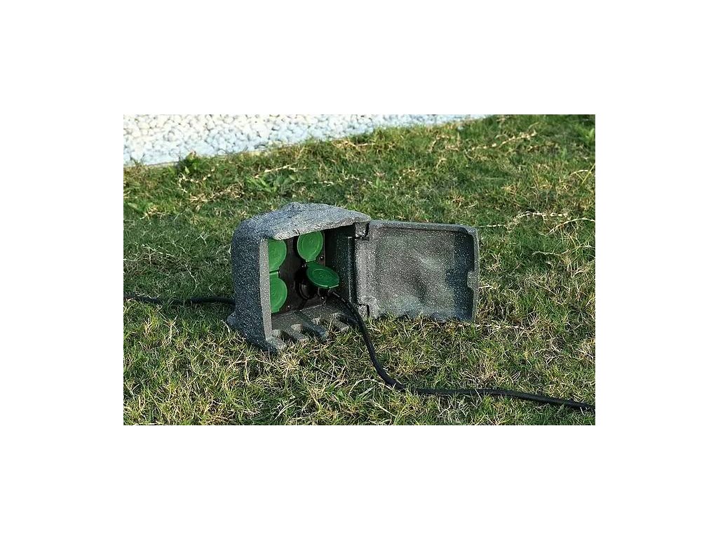 Napájecí rozvaděč Power Rock má dekorativní kamenný vzhled a používá se jako praktické připojení venku/na zahradě, například jako možnost připojení pro sekačky na trávu s 10 m pryžovým připojovacím kabelem a 4 zásuvkami s odklápěcím krytem. Materiál se skládá ze směsi kamenného prášku a syntetické pryskyřice. Elektrická součást musí být instalována autorizovaným odborníkem.