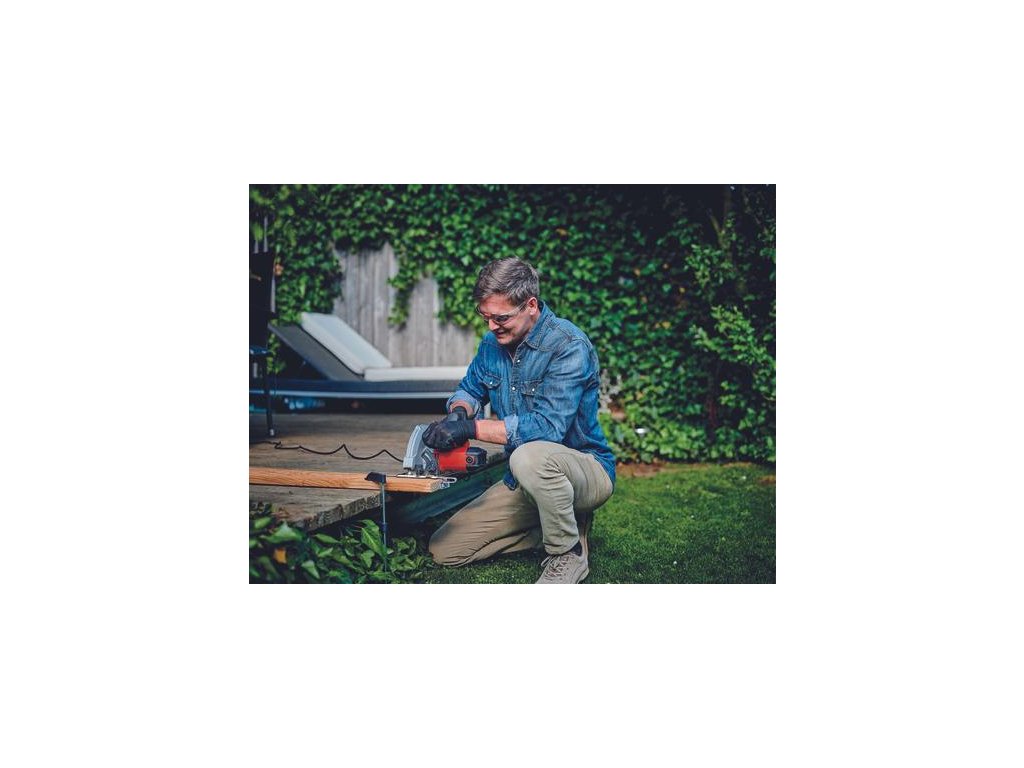 Díky aretaci vřetena je výměna pilového kotouče stejně snadná. Součástí dodávky je vysoce kvalitní pilový kotouč ze slinutého karbidu pro čisté a rovné řezy. Pilové kotouče s vnitřním průměrem 16 mm jsou kompatibilní s ruční okružní pilou. Maximální hloubka řezu při sklonu 45° je 38 mm, hloubka řezu při sklonu 90° je 55 mm. Velká přídavná rukojeť umožňuje práci bez únavy i při delším používání. Štípací klín také zajišťuje zvýšenou bezpečnost práce. Ruční okružní pila má přípojku pro odsávání prachu s kompatibilními přístroji, zajistí tak čisté pracoviště.