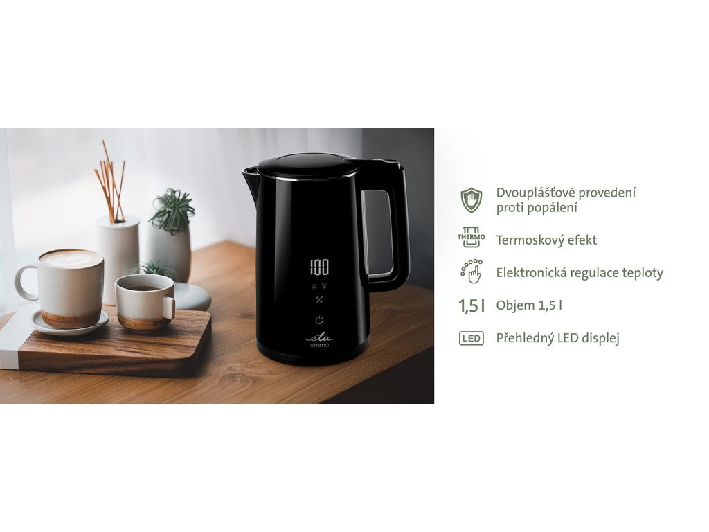 Designová konvice ETA Emma 5595 90000 s příkonem 2 200 W je nejen krásná, ale i praktická. Umožní vám totiž nastavit si přesně takovou teplotu, jakou zrovna potřebujete. Celkem můžete vybírat z 6 možností nastavení teploty (40 °C, 50–60 °C, 70 °C, 80 °C, 90 °C a 100 °C). Po dosažení požadované teploty konvice cinkne a automaticky se vypne. Maximální objem konvice je praktických 1,5 l a o aktuálním množství vody informuje vnitřní vodoznak. Konvice navíc disponuje i funkcí KEEP WARM, která udrží vodu na požadované teplotě až po dobu dvou hodin. Díky dvouplášťovému provedení bude konvice ETA Emma vždy příjemná na dotek a zabrání nechtěnému popálení.