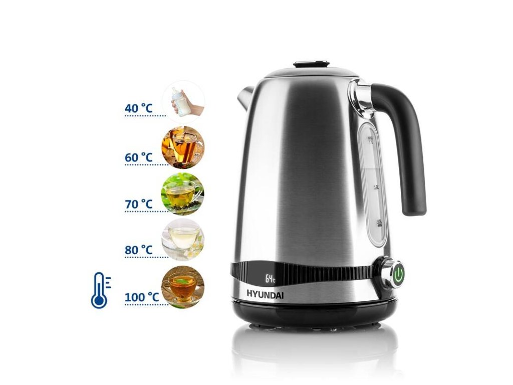 Designová rychlovarná konvice s příkonem 2 200 W v kvalitním nerezovém provedení Hyundai VK770, vám umožní připravit si jakýkoli horký nápoj s naprostou přesností. S funkcí regulace teploty od 40 °C do 100 °C (v krocích po 10 °C), si za pomocí tlačítka zvolíte dané stupně, které se vám zobrazí na LED displeji. Jakmile je vše hotové, informaci dostanete zvukovou i světelnou signalizací.
