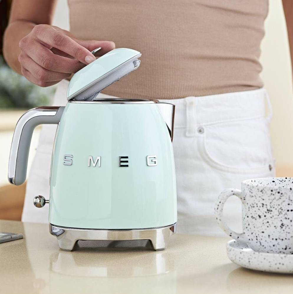 Rychlovarná minikonvice KLF05 značky Smeg z řady spotřebičů ve stylu 50. let je se svým ladným a barevným vzhledem ikonickým předmětem s nezaměnitelným designem od Raffaelly Mangiarotti a Mattea Bazzicalupa (Deepdesign). Díky kompaktním rozměrům se skvěle hodí k dekoraci jakéhokoliv prostředí, dokonce i těch s omezeným prostorem.
