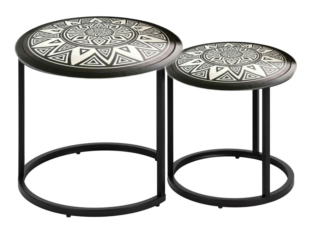 Dodejte svému interiéru nádech elegance a originality s tímto setem dvou odkládacích stolků. Menší stolek lze jednoduše zasunout pod větší, takže šetří místo a zároveň vytváří praktické i designové řešení. Oba stolky jsou vyrobeny ze 100% železa v černém provedení a zdobí je detailní mandalový vzor, který působí moderně i exoticky zároveň. Díky pevné konstrukci s nosností až 5 kg skvěle poslouží pro odkládání dekorací, šálku kávy či oblíbené knihy. Výška stolků je 50,2 cm a 47 cm – ideální kombinace pro stylové vrstvení i samostatné využití v jakékoli místnosti.