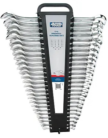 Sada kombinovaných klíčů Alpha Tools se skládá z 25 kusů klíčů. Jsou vyrobeny z chrom-vanadové oceli a jsou k dispozici ve velikostech 6/7/8/9/10/11/12/13/14/15/16/17/18/19/20/21/22/23/24/25/26/27/28/30/32. Klíče splňují normu DIN 3113.