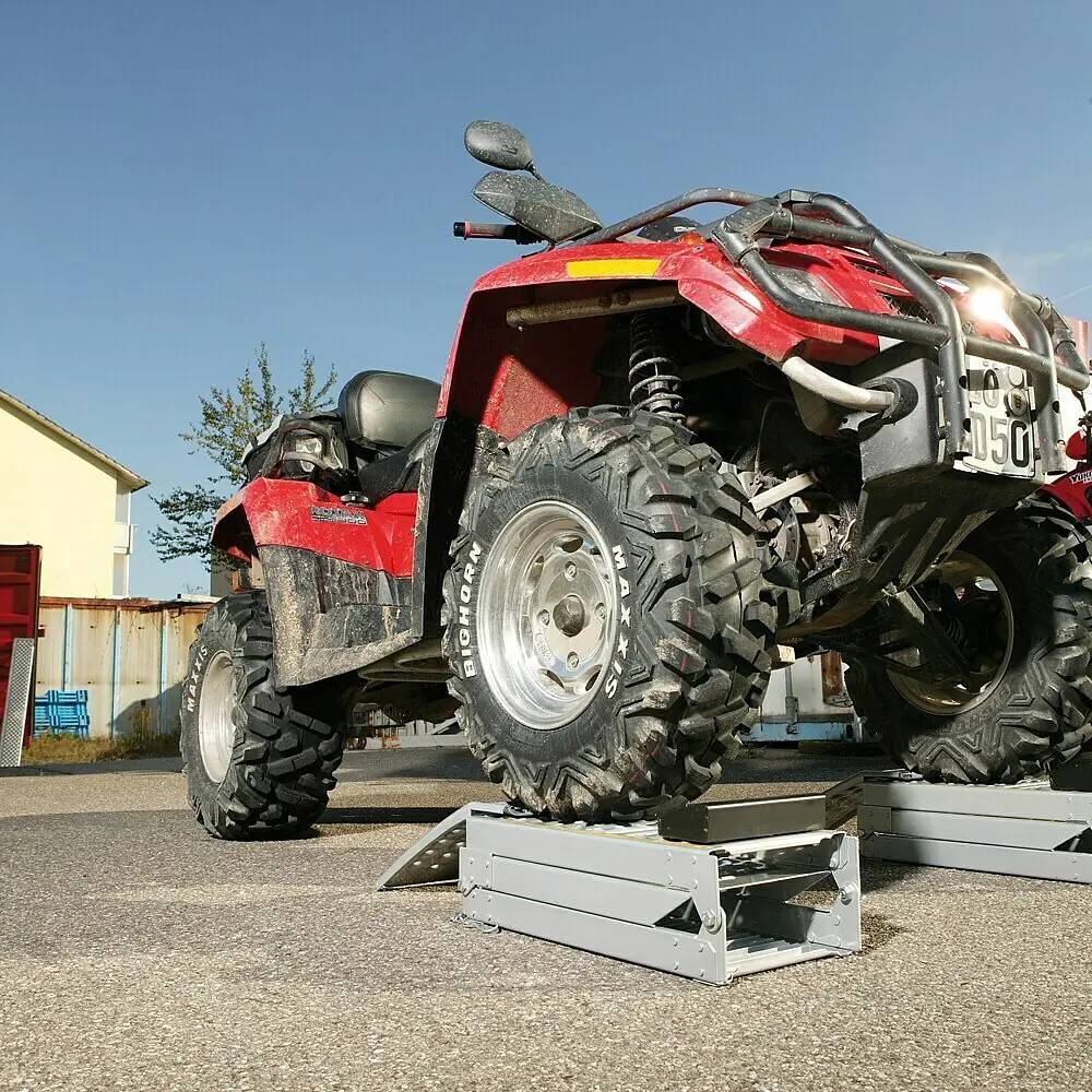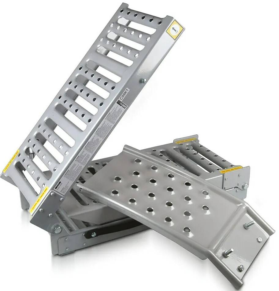 Tento rampový set sestává ze dvou kloubově skládaných hliníkových ramp o délce 200 cm a šířce 23 cm, určených pro snadné naložení vozidel, strojů nebo dalších břemen na přívěs, nákladní plošinu či ložnou plochu. Rampi mají profilovanou povrchovou úpravu pro lepší protiskluzový efekt a navíc je k nim přiloženo montážní šroubování pro zabránění posuvu ramp při nájezdu.