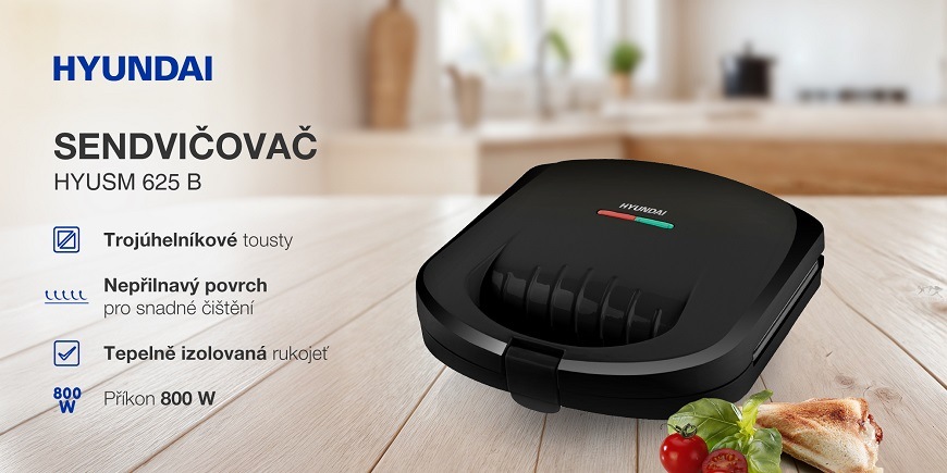 Snídaně je základ skvělého dne. Dodejte tělu po ránu dostatek energie kvalitním jídlem, s jehož přípravou vám pomůže sendvičovač Hyundai SM 625. Nemusíte vstávat o desítky minut dříve, abyste sobě a své rodině připravili tu nejchutnější snídani. Tento model zvládá najednou připravit dva sendviče (4 trojúhelníky), výkon 800 W bleskovou přípravu a funkce automatické regulace teploty zase to, že se nemusíte o vůbec nic starat. Perfektně se navíc hodí i do malých domácností, neboť jeho uskladnění kromě kompaktních rozměrů usnadňuje i možnost uložení ve svislé poloze.