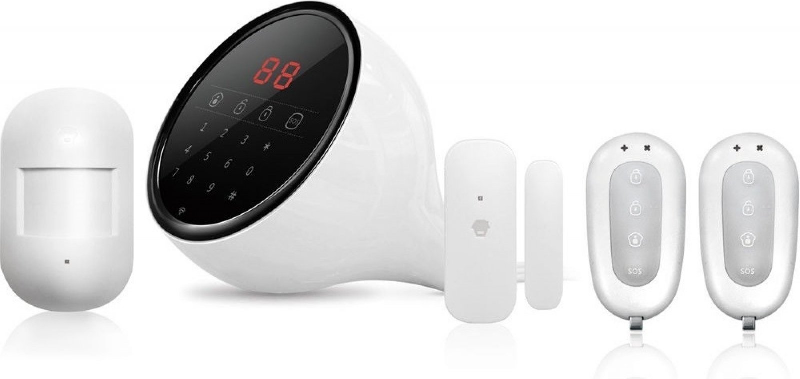 - Funkce: zasílání notifikací až na 5 telefonních čísel, zpoždění při vstupu / odchodu, 110 dB siréna, načasování deaktivace / aktivace alarmu, paměť až na 20 protokolů událostí