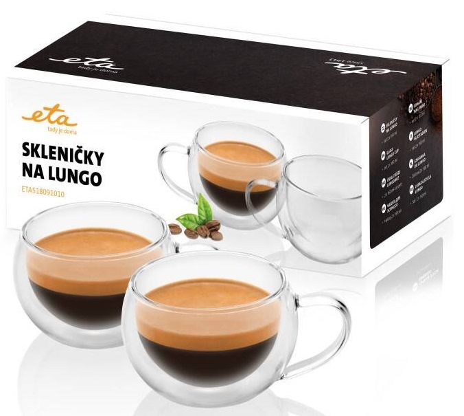 Oblíbená káva lungo bude chutnat ještě lépe z moderníchskleniček ETA 5180 91010. Jsou vyrobeny zborosilikátového skla, které je známé svou mimořádnouodolností a lehkostí. Díky použití dvou stěn vydrží nápoj v tomto šálkumnohonásobně déle teplý, než v obyčejných hrnečcích. Přitom se nemusíte obávat, že se o stěnu popálíte. A sobjemem 160 mlse skvěle hodí nejen na lungo (prodloužené espresso), ale třeba i na čaj či kakao.