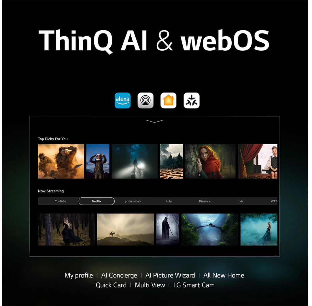 Moderní operační systém webOS 23 přináší snadné ovládání, přístup k oblíbeným aplikacím i streamovacím službám. Samozřejmostí je Magický dálkový ovladač, hlasové ovládání, Sportovní upozornění a propojení s chytrou domácností přes LG ThinQ.