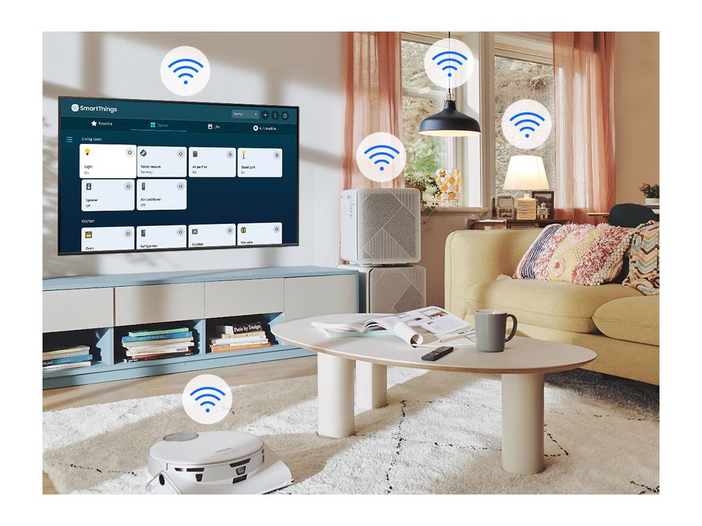 Televizor podporuje SmartThings, což je platforma pro propojení a ovládání chytré domácnosti. Umožňuje snadno ovládat kompatibilní zařízení – od světel a termostatů až po robotické vysavače – přímo z obrazovky TV nebo přes mobilní aplikaci. Můžeš vytvářet automatizace, sledovat spotřebu energie nebo nastavit rutiny, které se spustí podle času či přítomnosti v domácnosti.