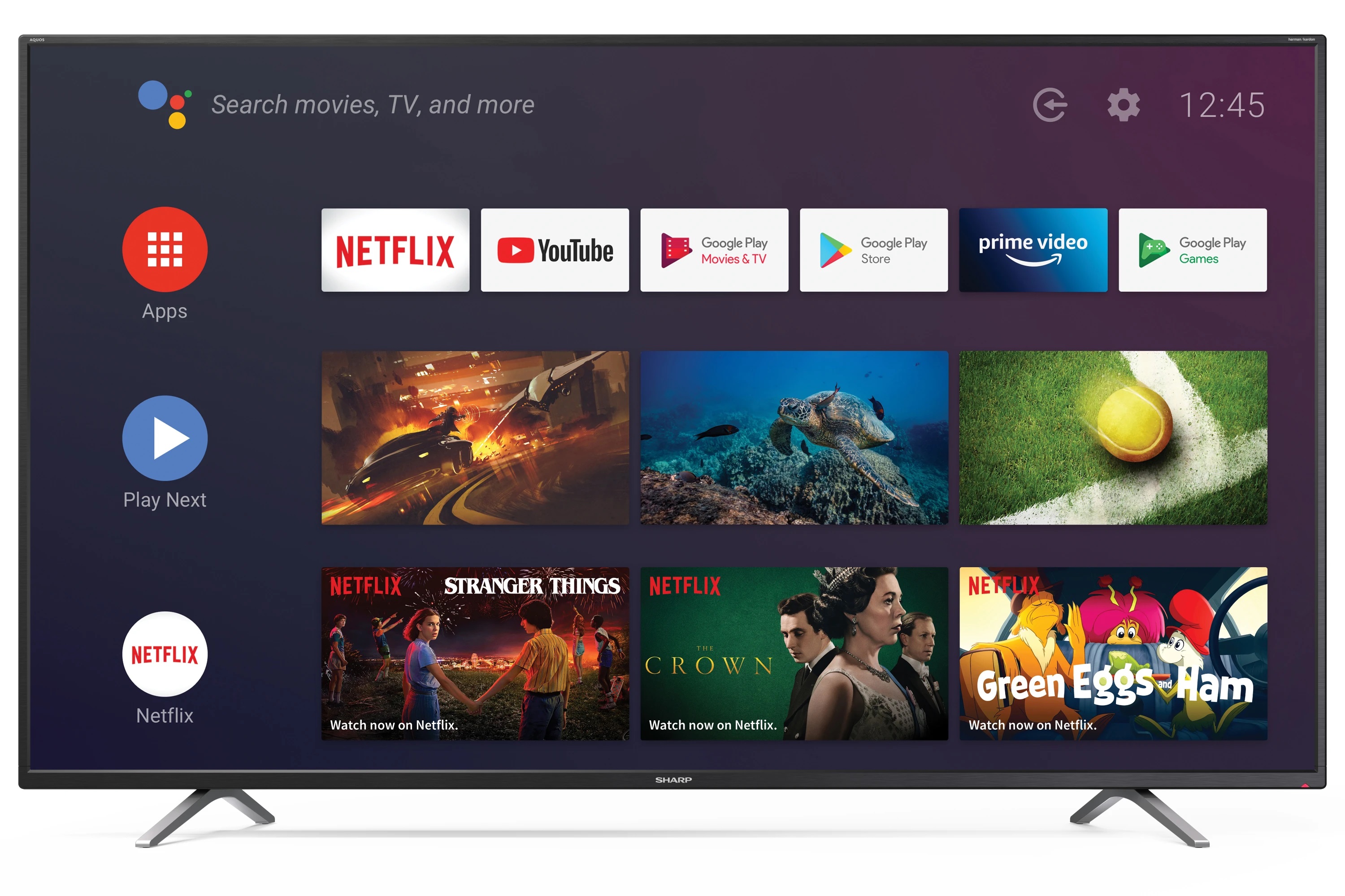 - Aplikace Netflix, Youtube, Google Play Movies & TV, Google Play Store, Prime Video