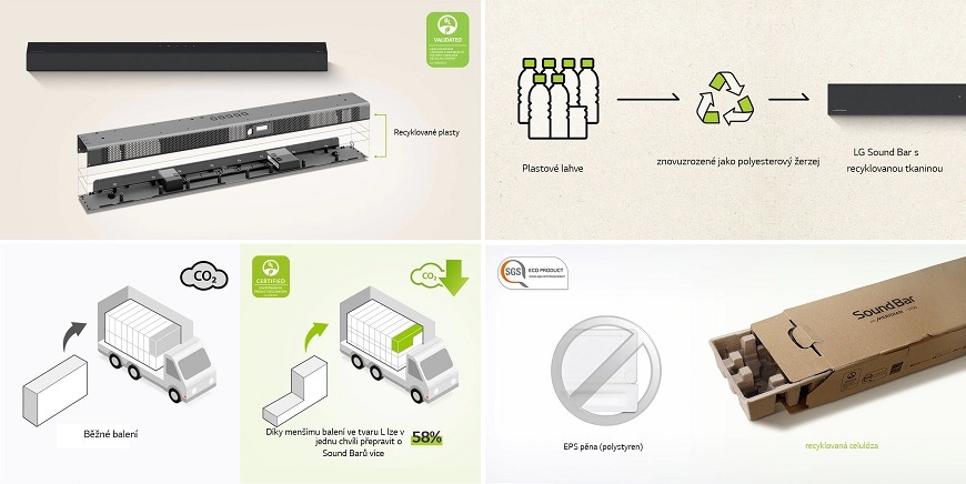 Horní a spodní část tohoto modelu vyrobena z recyklovaných plastů. Ale to není vše! Design soundbarů je pečlivě promýšlen, což dokládá použití žeržejové tkaniny, vyrobené z plastových lahví. Důraz na ekologii se klade i při přepravě, pro kterou jsou využívány krabice ve tvaru L, a při balení – uvnitř najdete lisovanou celulózu.