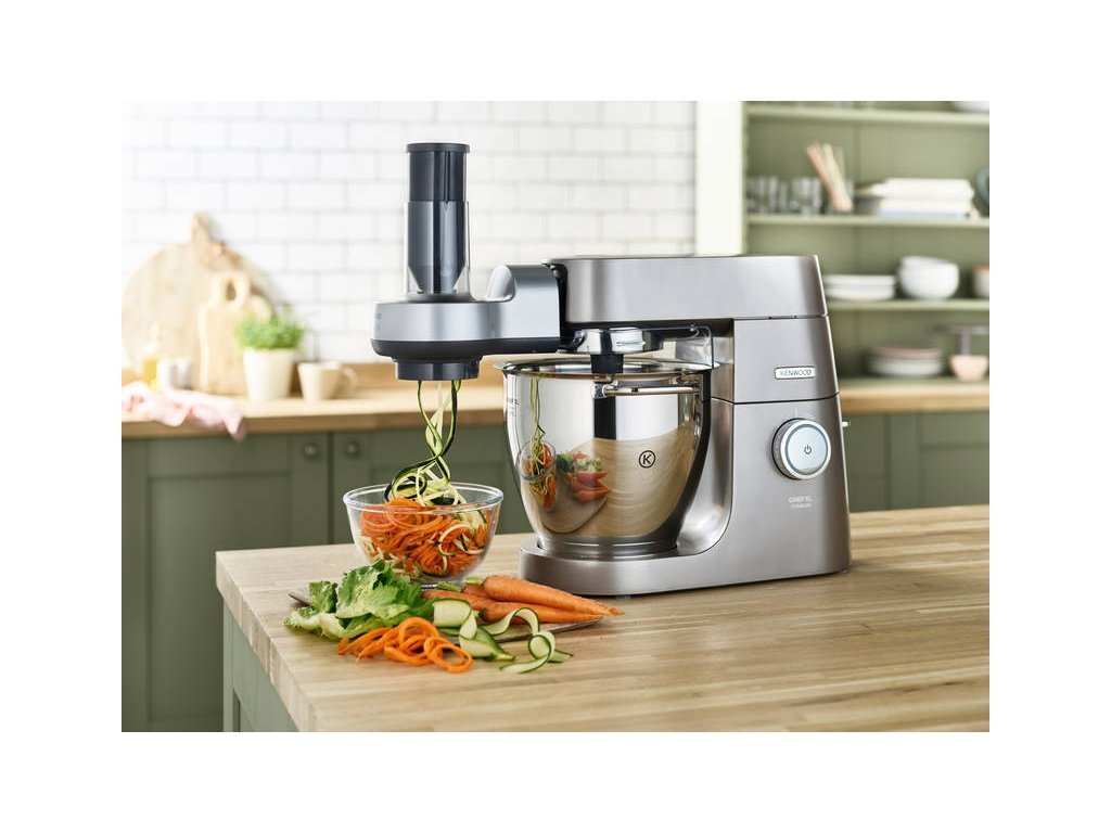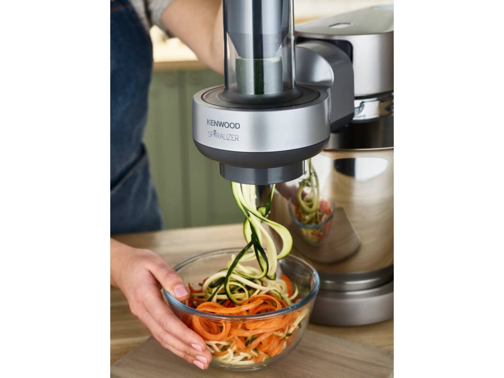 Vytvořte z ovoce a zeleniny nudličky nebo proužky a najděte nové a chutné způsoby, jak získat chutný a zdravý pokrm. Pokud má váš mixér Chef nebo Chef XL otočný výstup je nástavec kompatibilní s vaším spotřebičem. Omezit sacharidy nebylo nikdy snazší díky spiralizéru, který během několika minut připraví estetický dokonalý pokrm. Proměňte ovoce a zeleninu v nejrůznější tvary, abyste změnili podobu klasických těstovinových jídel, hlavních jídel, salátů a dezertů.