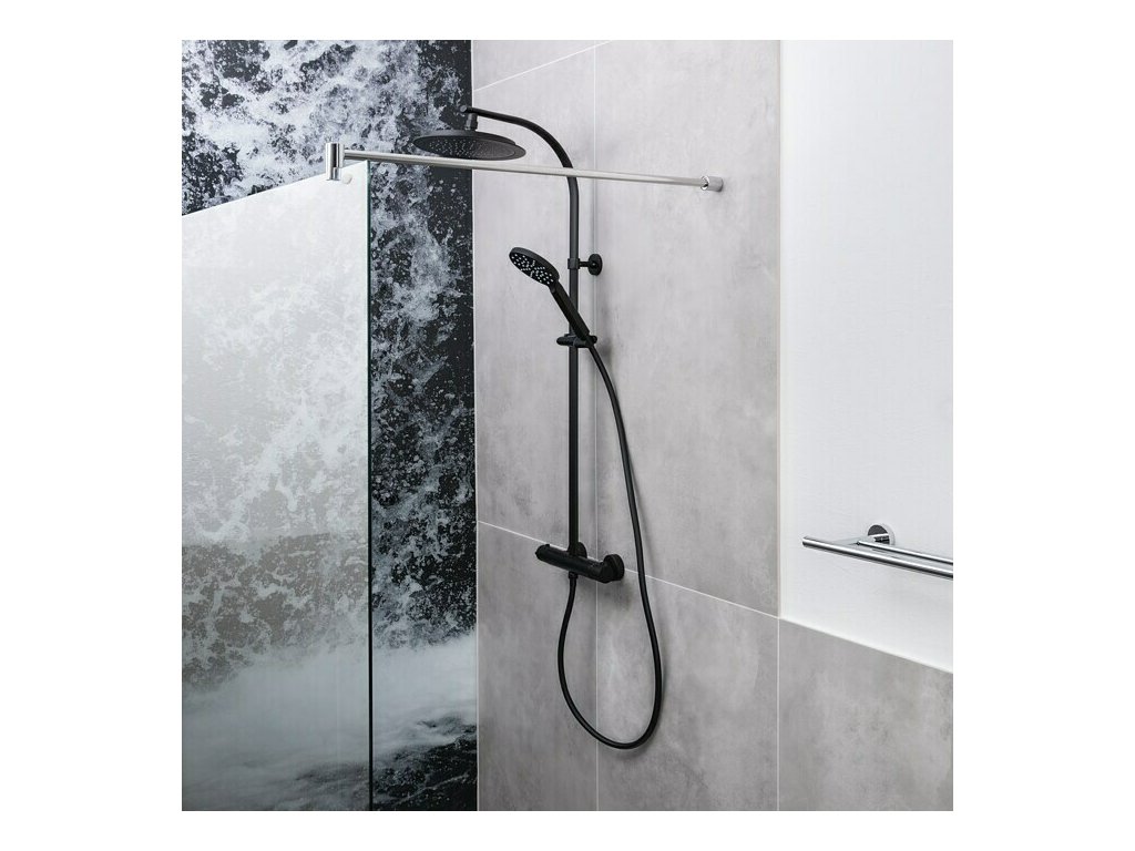 Sprchový systém je vynikajícím stylovým řešením přívodu vody do sprchového koutu. Je vyrobený z kvalitní mosazi, opatřený vkusným černým lakováním. Baterie je termostatická s tepelnou pojistkou na 38 °C, takže nehrozí opaření horkou vodou. S hadicí dlouhou 150 cm se navíc vysprchujete velice pohodlně. Ruční sprcha navíc nabízí 3 intenzity proudu vody. Vynikající volba pro vaši koupelnu.
