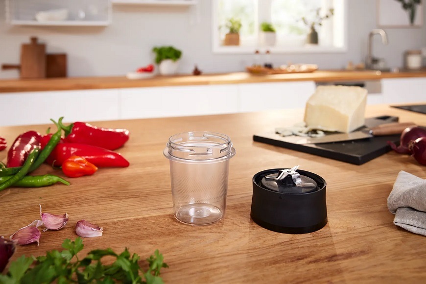 Bezpečnostní víko dovolí spustit mixér, až je nádoba spolehlivě nacvaknuta na svém místě. Navíc má praktický otvor na nalévání, aniž byste ho museli vyjmout z mixovací nádoby.
