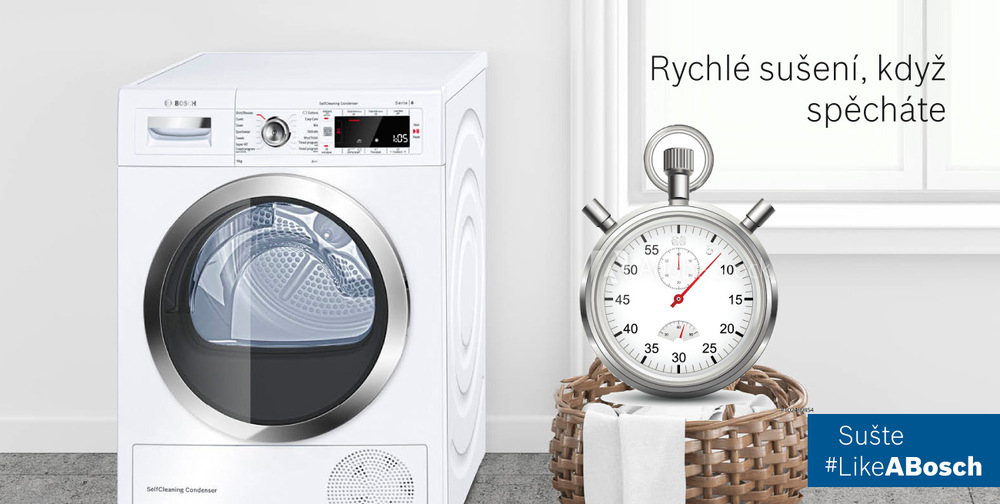 Rychle, rychle, spěchám! Pro sušičku Bosch to není žádný problém. 40minutový program pro rychlé sušení je vhodný pro menší množství oblečení ze syntetického materiálu a tenkých tkanin. Přesný systém kontroly pohlídá teplotu a sleduje stupeň vlhkosti oblečení v reálném čase. Oblečení si tak můžete obléknout ihned po vytažení ze sušičky.