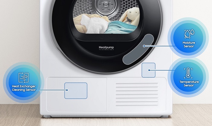 O prádlo v sušičce Samsung se strachovat nemusíte. Je o něj dobře postaráno díky trojici senzorů technologie OptimalDry, která monitoruje vlhkost a optimalizuje dobu sušení pro ještě větší úsporu energie. A až nadejde čas na vyčištění výměníku tepla, upozorní vás na to.