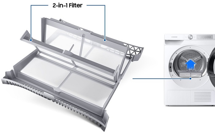 Bezpečná, výkonná a téměř bezúdržbová. Sušička Samsung je vybavena filtrem 2 v 1 s dvouvrstvým síťovým filtrem, takže filtr výměníku tepla není zapotřebí, což značně usnadňuje údržbu sušičky. V případě potřeby čištění filtru a výměníku tepla vás upozorní dvojice praktických alarmů.