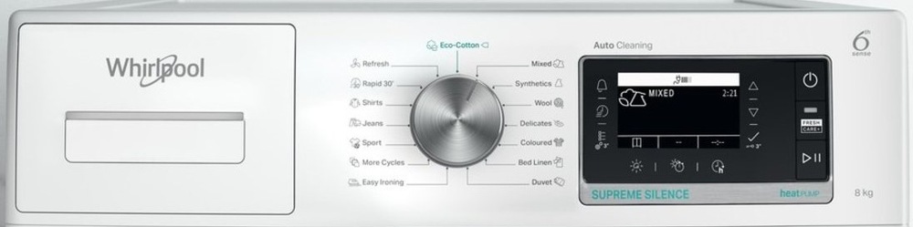 Sušička Whirlpool Supreme Silence W7 D84WB EE má v nabídce 21 programů sušení včetně speciálních pro ručníky, plyšové hračky, košile či vlnu. Všechny informace o průběhu vybraného cyklu, spotřebě a další funkce můžete sledovat na přehledném LCD displeji.
