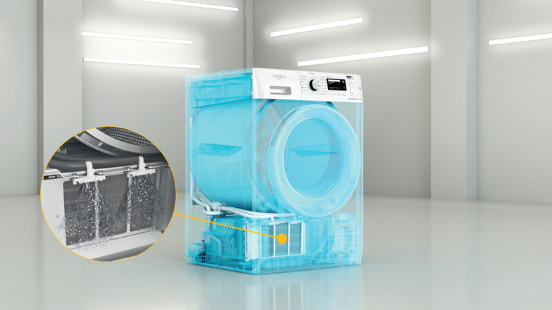 Manuální čištění filtru kondenzátoru můžete zcela vypustit z hlavy – sušička Whirlpool Supreme Silence se o jeho čištění postará sama. Tento filtr je automaticky oplachován během sušení vodou, která je k němu přiváděna dvěma tlakovými tryskami. Filtr je tak vyčištěn efektivně a vám odpadnou starosti s jeho údržbou.
