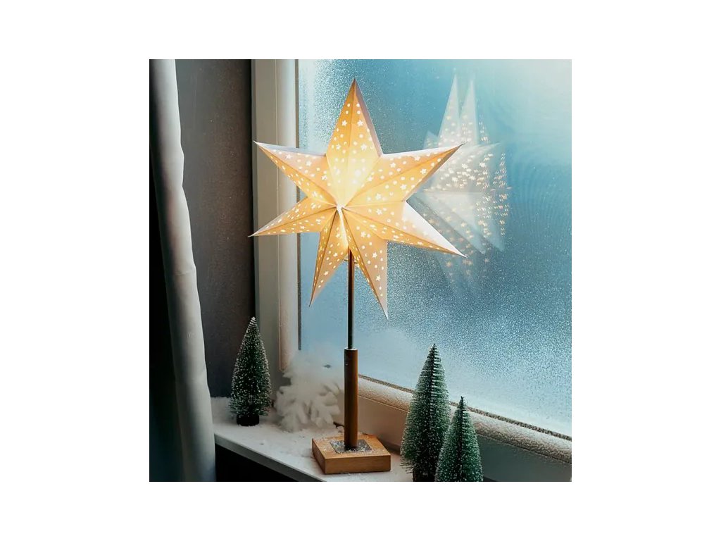 Světelná dekorace SOLVALLA ve tvaru hvězdy vytvoří ve vašem interiéru příjemnou a sváteční atmosféru. Elegantní papírové provedení s jemnými výřezy ve tvaru hvězdiček propouští světlo a vytváří krásný dekorativní efekt, který se skvěle hodí do oken, na komodu nebo na sváteční stůl. Díky průměru 45 cm a výšce 65 cm se stane výrazným, ale stále vkusným doplňkem vánoční výzdoby.
