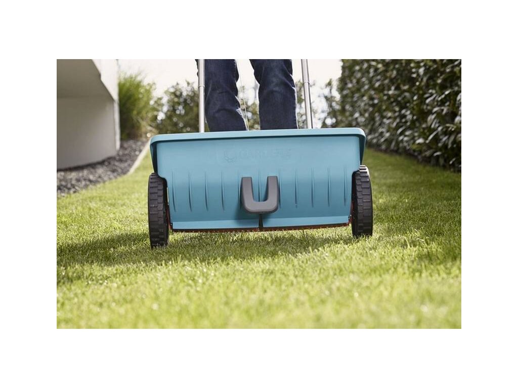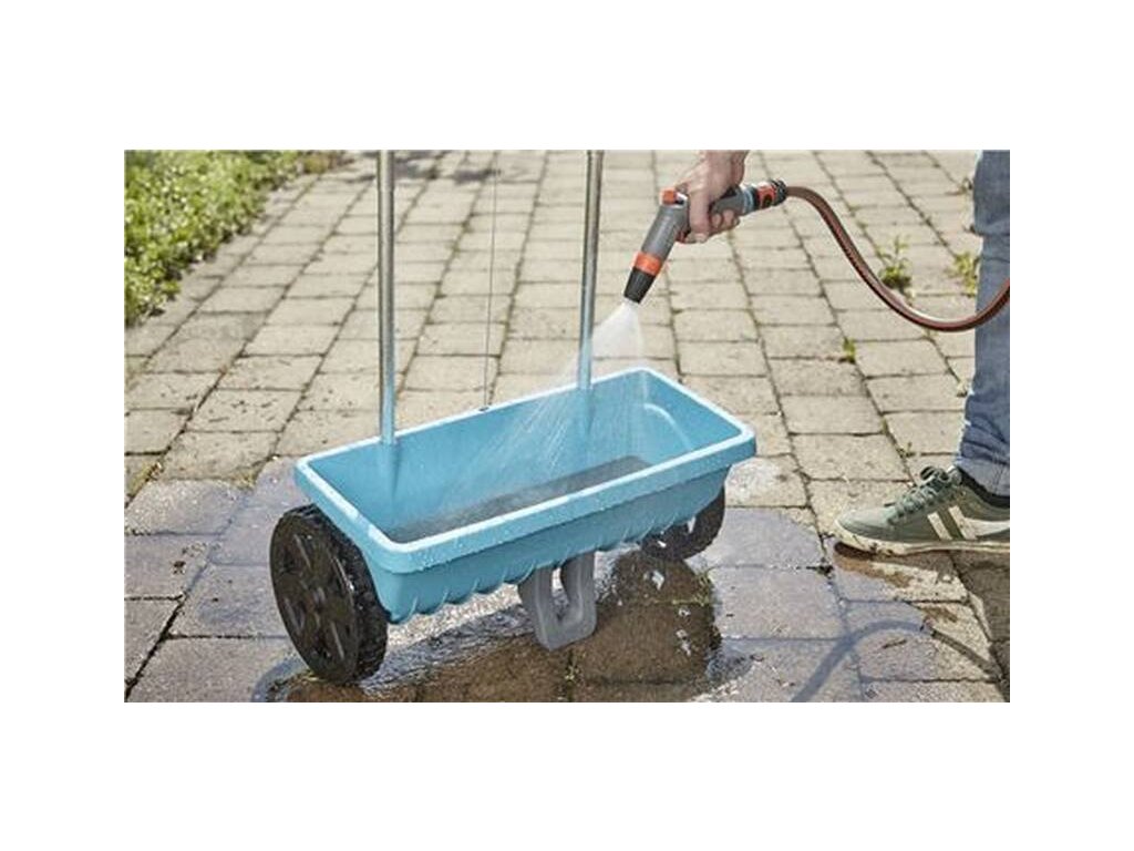 Vozík je vybaven i posuvným krytem s těsnícím okrajem, jenž těsně uzavírá zásobník a zabraňuje sypání, když stojí nebo jej plníte. Výhodou sypacího stroje je dlouhá životnost vzhledem ke konstrukci odolné vůči korozi a povětrnostním vlivům. Pro čištění lze použít vodu.
