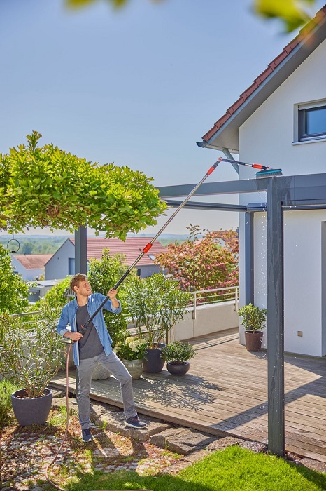 Teleskopická násada Gardena Cleansystem M - XL 18804-20 je vhodná pro mokré čištění na těžko dostupných místech . Rukojeť s vedením vody usnadňuje mokré čištění vyšších povrchů, např. oken. Pro ještě pohodlnější práci na vysokých nebo těžko dostupných místech je ideální rukojeť s vedením vody. Jednoduše se připojí k zahradní hadici pomocí originálního zásuvného konektoru Gardena System. Teleskopická násada Gardena M - XL rozšiřuje akční rádius při čištění s nastavitelnou délkou 155-260 cm. Pro pohodlnou práci je rukojeť vyrobena z vysoce kvalitního, robustního hliníku a má povlak, takže povrch není studený ani při nízkých venkovních teplotách. Po připojení k zahradní hadici jediným pohybem lze plynule regulovat přívod vody a uzavřít jej na rukojeti. Tím se eliminuje nepříjemné chození k kohoutku během používání.