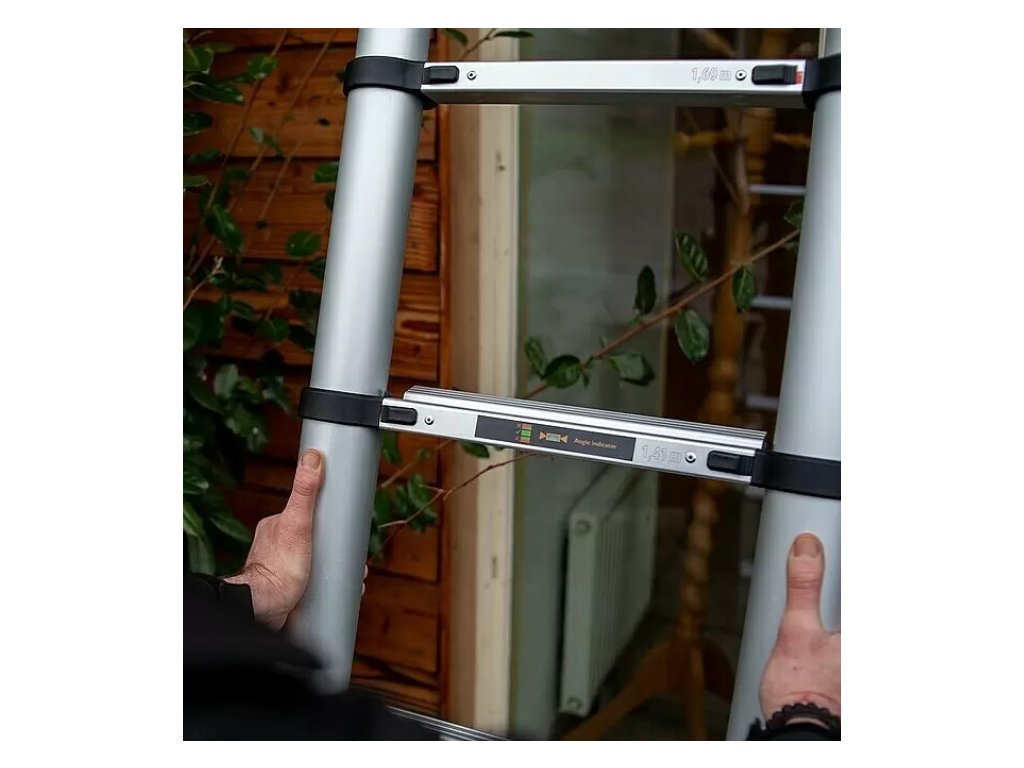 Indikátor úhlu na tomto hliníkovém teleskopickém žebříku ukazuje zeleně, když je žebřík v bezpečném úhlu. Pokud je v horní nebo spodní části indikátoru úhlu stále vidět červená, není žebřík v bezpečném úhlu. Nastavujte úhel žebříku, dokud indikátor úhlu nebude zcela zelený. Nyní můžete bezpečně používat profesionální teleskopický žebřík.
