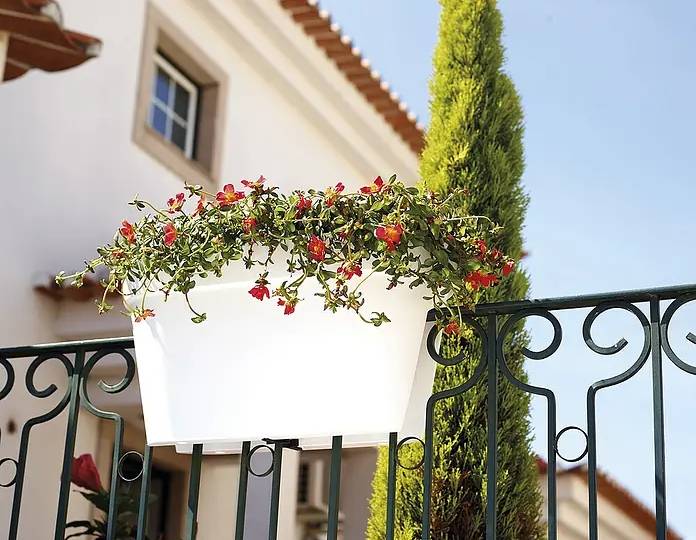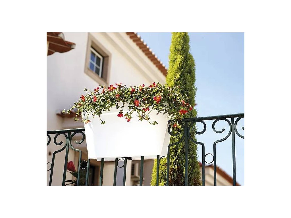 Truhlík se vejde na zábradlí až do max. šířky 6,5 cm a lze jej na ně jednoduše umístit. Drží se ve vodorovné poloze a pomocí dvou držáků se připevňuje k zábradlí.