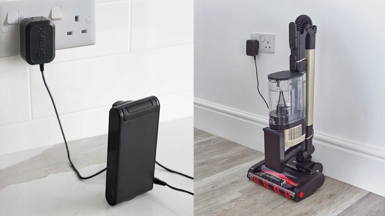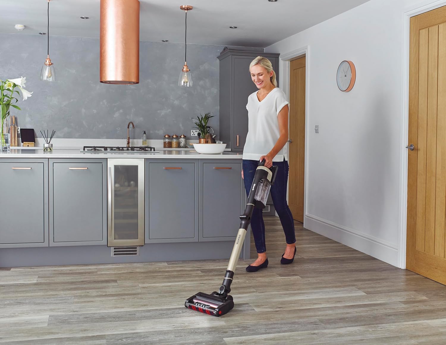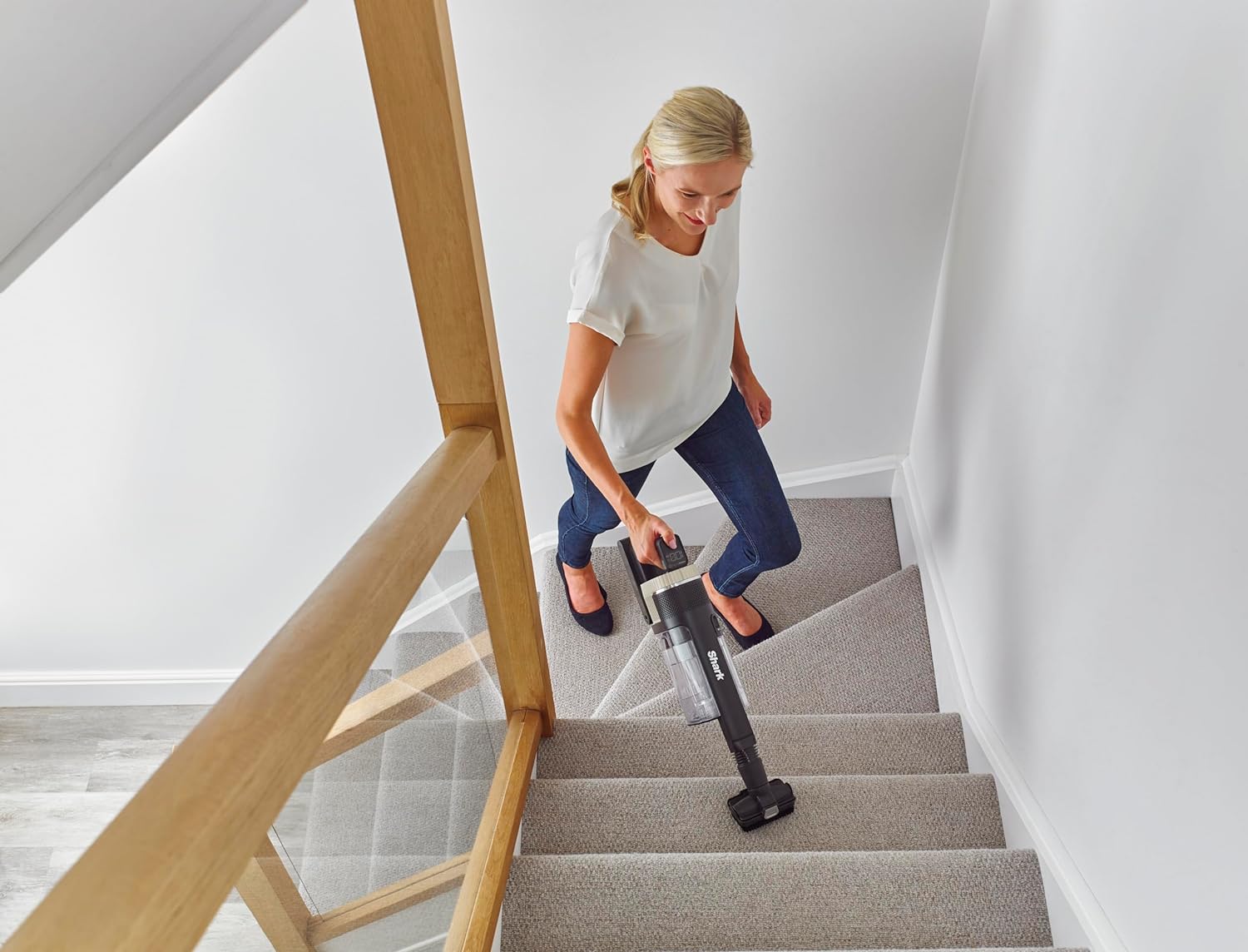 Podlahová hlavice Shark DuoClean klouže z koberců na tvrdé podlahy se dvěma motorizovanými kartáčovými válečky spolupracujícími v jedné podlahové hlavě – kartáčový váleček Anti Hair Wrap Plus čistí hluboko do koberců, vytahuje usazenou špínu a sbírá vlasy, zatímco měkký přední válec kartáče nasává nečistoty a zvedá přilepený prach z tvrdých podlah. Po stisknutí tlačítka se dokáže flexibilní hubice ohnout, aby dosáhla a vyčistila vše pod nízko položeným nábytkem. Když dokončíte úklid, sklopte vysavač pro kompaktní, volně stojící skladování a nabíjení.