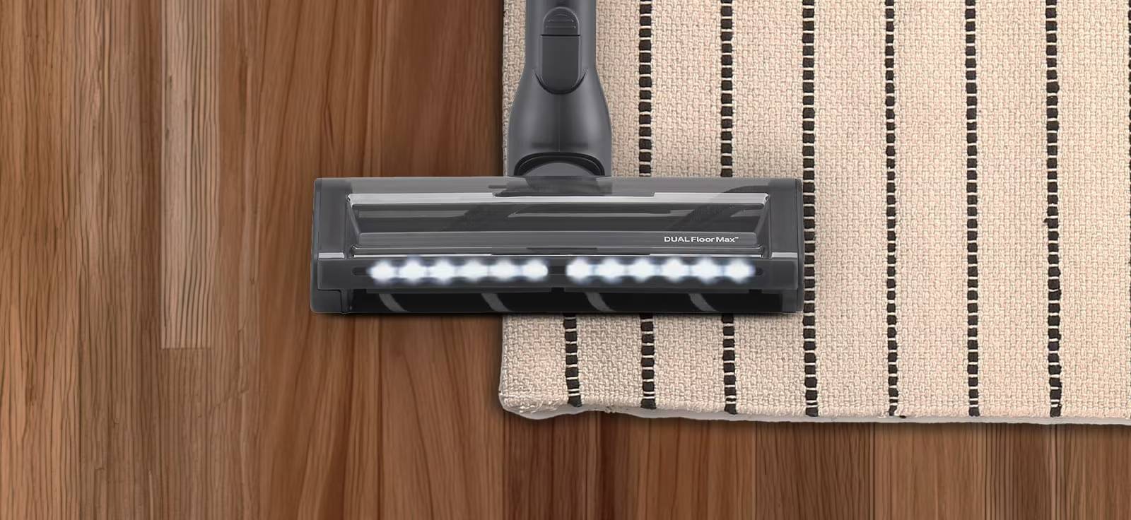 Dalším výrazným benefitem je výbava pro více povrchů: kartáč Dual Floor Max™ s LED osvětlením umožňuje pohodlně přecházet z tvrdých podlah na koberce bez nutnosti měnit nástroj. Pro uživatele, kteří chtějí mít přehled o stavu vysavače, je k dispozici LCD displej na rukojeti, který zobrazuje stav baterie, režim či upozornění na údržbu filtru.