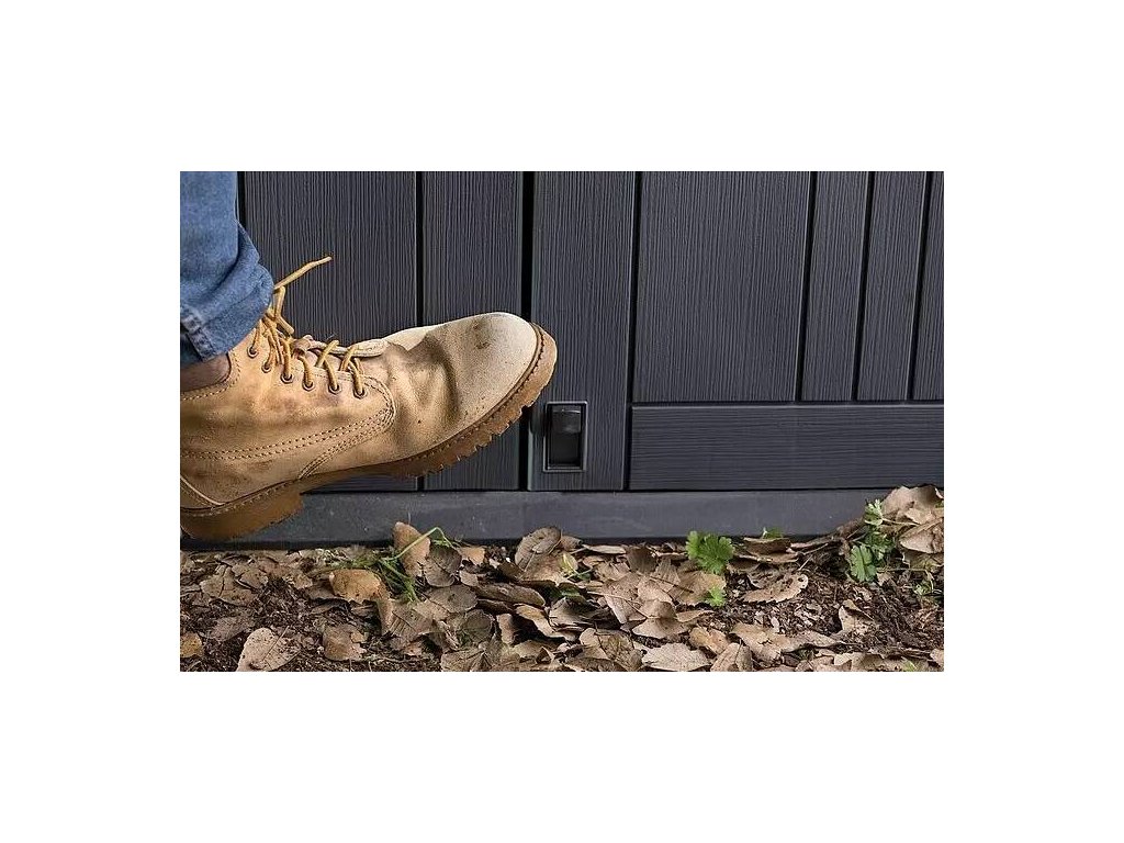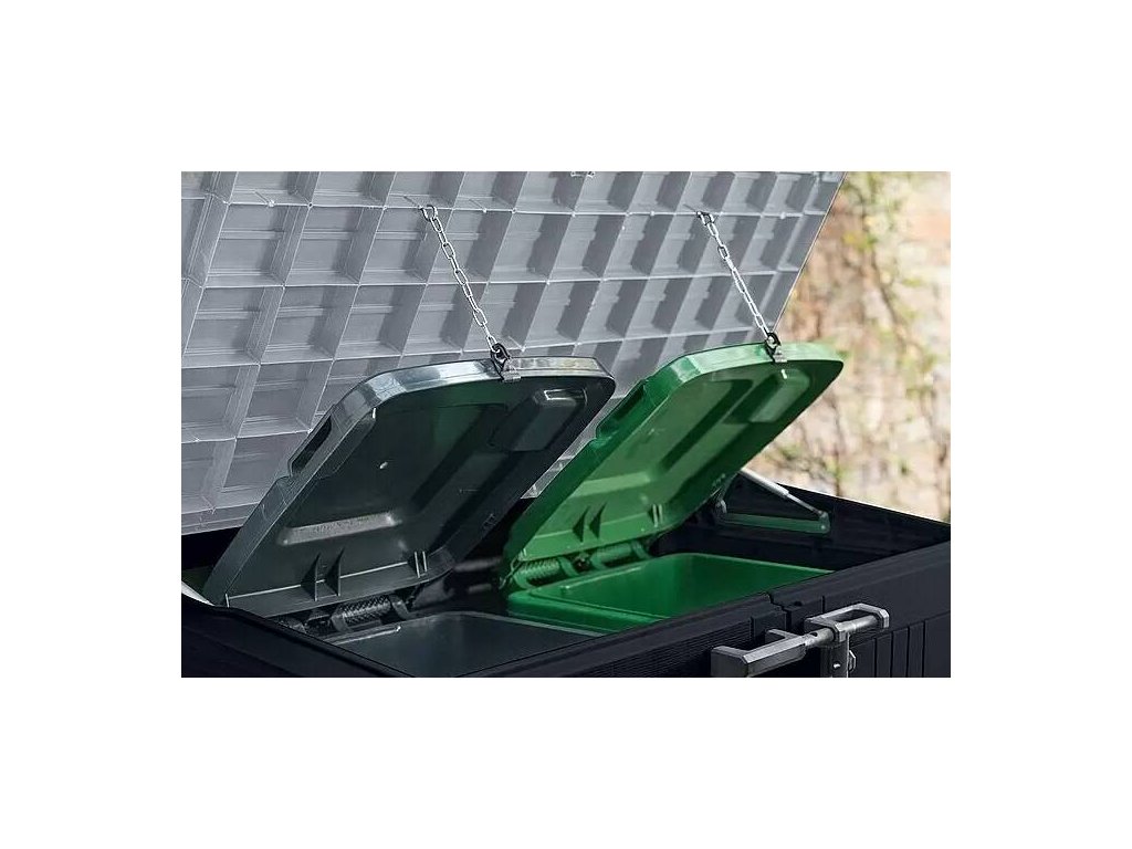 Box v dřevěném vzhledu je ideální pro skladování popelnice, ale také různých zahradních nástrojů, sekaček na trávu, grilů a mnoho dalšího. Moderní úložný box pojme 2 popelnice o objemu až 120 litrů. Je vyroben z polypropylenového plastu. Díky tomu je obzvláště odolný vůči povětrnostním vlivům a UV záření a je ideální pro venkovní použití. Zahradní box lze uzavřít visacím zámkem (není součástí balení).