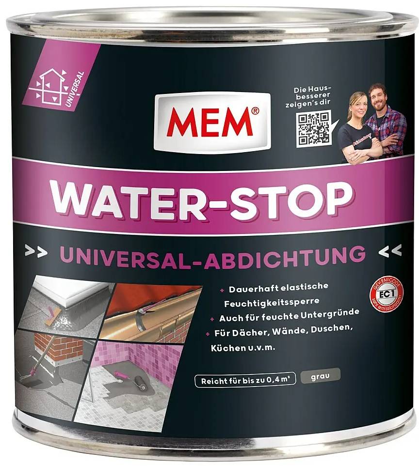 Univerzální těsnící hmota MEM Water-Stop je trvale elastická bariéra vůči vlhkosti a lze ji použít jak v interiéru, tak v exteriéru. Univerzální hydroizolace je vhodná pro použití na velkou škálu podkladů, jako je beton, dřevo, kámen, kov, broušená střešní lepenka, polystyren či mnoho dalších plastů. Výrobek je během vytvrzování necitlivý na vlhkost.