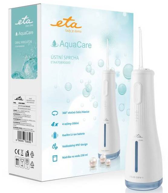 Doveďte péči o váš chrup k dokonalosti s ústní sprchou ETA AquaCare II 4708 90000. Účinně odstraní nejen zubní plak, ale i nečistoty a problémové bakterie z mezizubních prostor a zpod dásní. Díky kvalitnímu Li-Ion baterii vydrží na jedno nabití pracovat až 50 minut. Ke kompletnímu vyčištění vám přitom postačí pouhé 2 minuty. Ústní sprcha ETA AquaCare II disponuje velkorysou nádržkou na vodu o objemu 250 ml a stupněm ochrany IPX7, kontaktu s vodou se tak obávat nemusíte. Ovládání je velmi snadné díky ON/OFF spínači a ergonomické rukojeti. Praktická je i světelná signalizace. Ústní sprchu nabijete pomocí USB-C kabelu za přibližně 3 hodiny.
