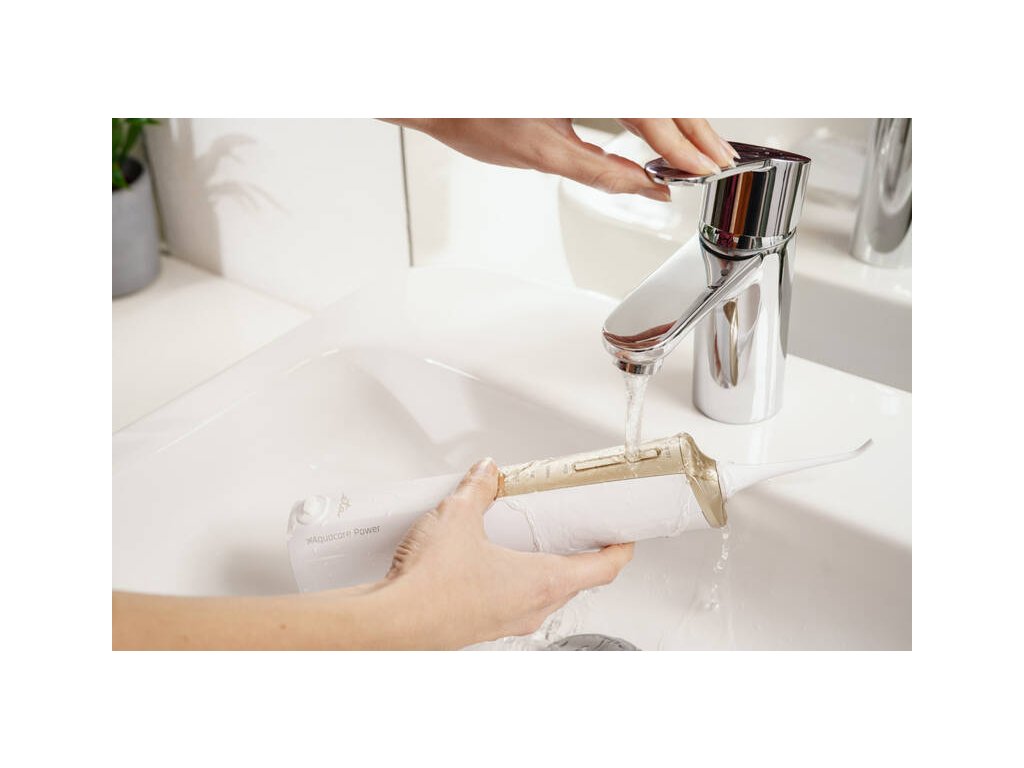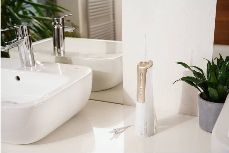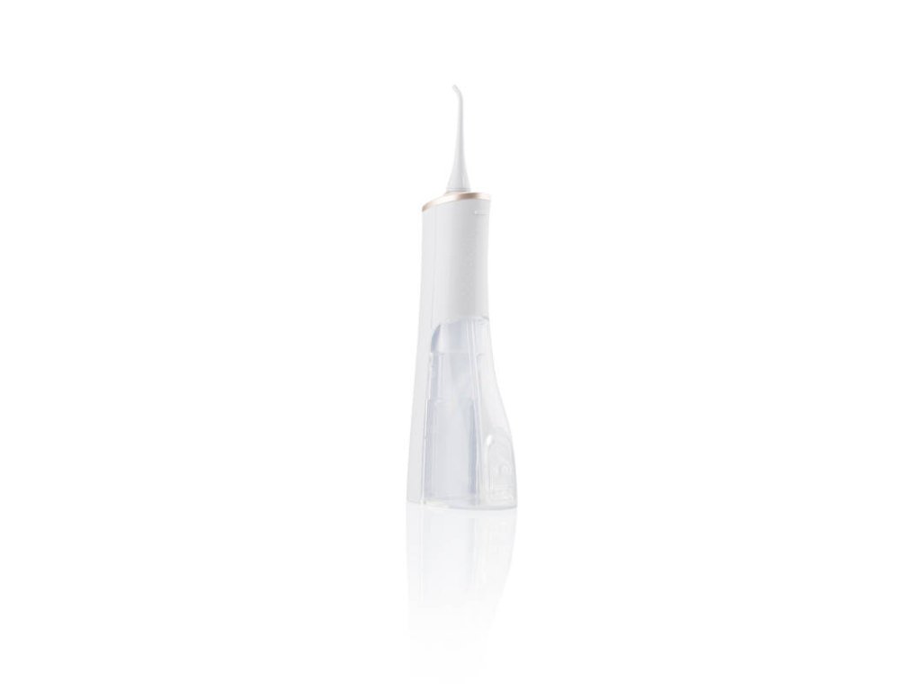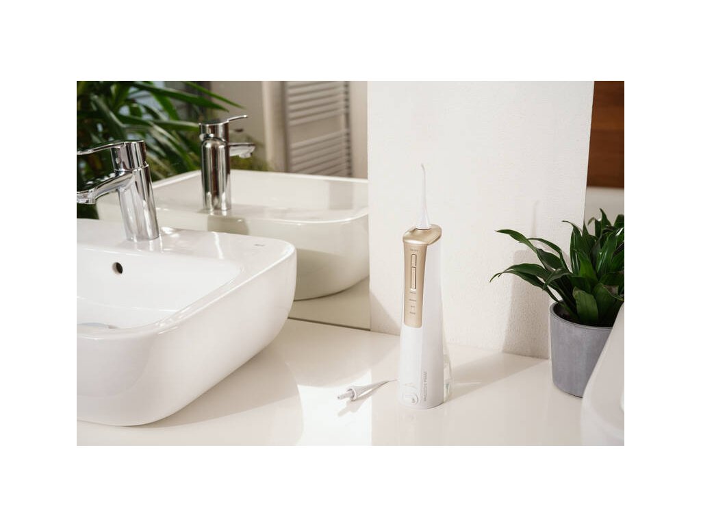 Ústní sprcha disponuje nádržkou na vodu o objemu 200 ml a stupněm ochrany IPX7, kontaktu s vodou se tak obávat nemusíte. Ovládání je velmi snadné díky ON/OFF spínači a ergonomické rukojeti. Praktická je i světelná signalizace, která vás upozorní na vybití, nabíjení, úplné nabití a na zvolený režim. Nabíjení ústní sprchy probíhá pomocí USB kabelu a trvá přibližně 2,5 hodiny.