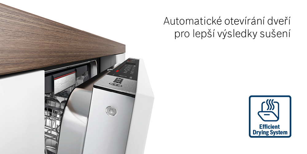 Nádobí se má do skříněk ukládat suché. Abyste nemuseli nádobí dosušovat utěrkou, funkce EfficientDry po ukončení programu automaticky otevře dveře myčky. Toto praktické řešení šetří energii, zdokonaluje proces sušení, zabraňuje kondenzaci a šetrně ochlazuje nádobí, aby bylo ihned připravené k jeho uložení.
