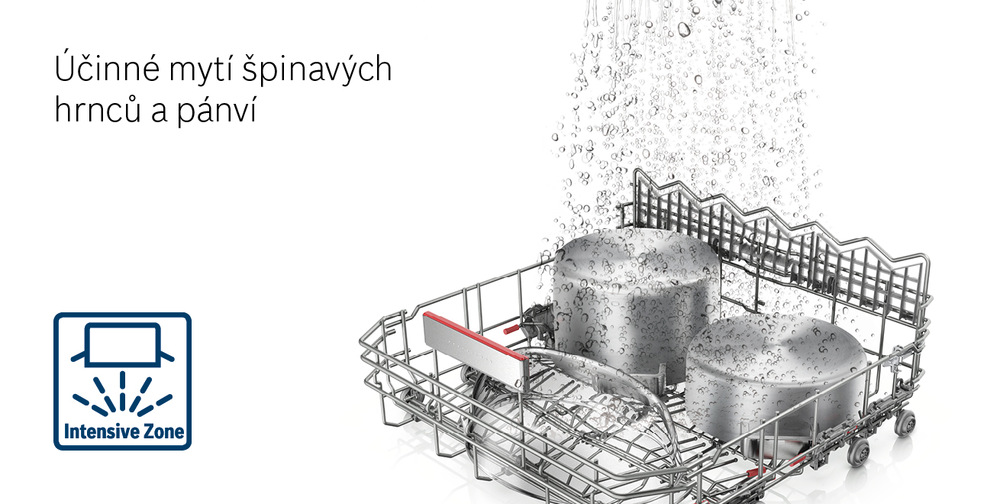 Funkce Intensive Zone zajišťuje vyšší tlak ostřiku a zvyšuje teplotu v dolním koši. Tím zajišťuje optimální mytí silně zašpiněných hrnců a pánví, zatímco mnohem choulostivější nádobí lze mýt v horním koši.