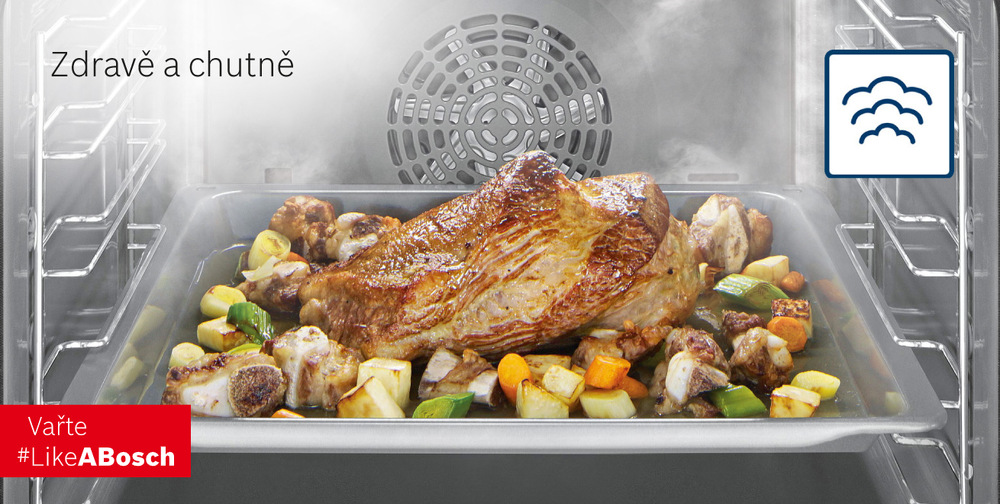 Velkým pomocníkem při přípravě skvělých pokrmů je vestavná pečící trouba Bosch HSG656XS1 s objemem 71 l. Ta připraví šťavnaté pokrmy s křupavou kůrkou díky přídavné páře. Horkovzdušná trouba se 14 druhy ohřevu dokáže všechny pokrmy přivést k dokonalosti. Při přípravě masa je skvělým pomocníkem teplotní sonda PerfectRoast. Díky optimální distribuci horkého vzduchu pečte až na 4 úrovních najednou. TFT displej je přehledný a informuje o všech potřebných funkcích. Senzorová technologie PerfectBake měří vlhkost a automaticky upravuje dobu pečení a teplotu.