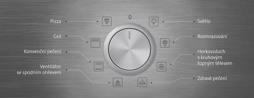 Pokud zvolíte PEČENÍ S VENTILÁTOREM (horký vzduch), spolu s topným tělesem se zároveň spustí i větrák. To způsobí intenzivní proudění horkého vzduchu kolem připravovaného pokrmu. Výsledkem bude rovnoměrné a mnohem rychlejší pečení.