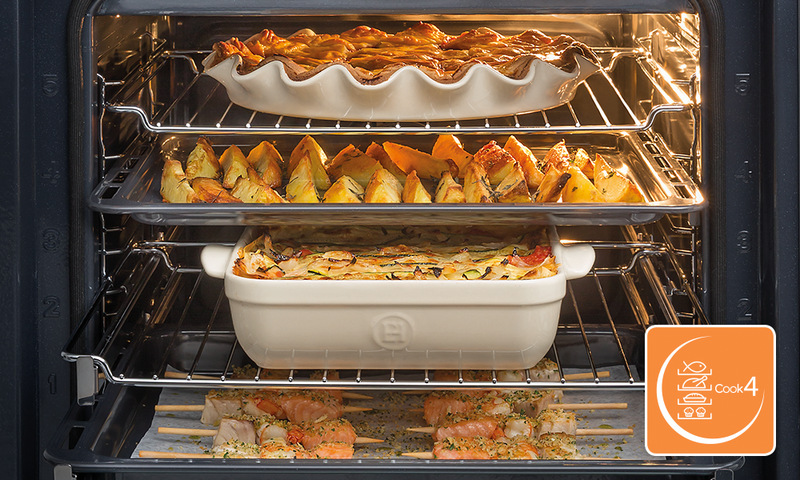 Buďte flexibilní s funkcí Cook4. Tato volba vám přináší možnost připravovat až čtyři pokrmy naráz, bez rizika smíchání chutí či vůní. Vysoce účinné topné těleso po aktivaci funkce Cook4 spolupracuje se systémem cirkulace vzduchu, který rovnoměrně ohřívá vnitřní prostor trouby a zajišťuje konstantní oběh vzduchu. Bezkonkurenční kvalita pečení spolu s výraznou úsporou času a energie je tak zaručena.