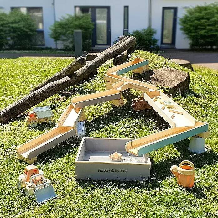 Děti si rády hrají s vodou, zejména v horkých měsících. Tato flexibilní vodní dráha s s moderním designem nabízí pro tento účel hodiny a hodiny zábavy. Vodní dráha se skládá z jednotlivých dřevěných koryt, která lze flexibilně upravovat a znovu a znovu sestavovat - podle nálady a preferencí. Na konci dráhy lze vodu shromáždit v záchytné vaně a znovu ji použít. Zvláštností je dráha Y, kde lze vodu odklánět a klikatá dráha. Vodu lze také přehradit na různých místech zátkami. Díky dodaným dřevěným kostkám lze spád postavit individuálně. Vodní dráhu lze samozřejmě libovolně rozšiřovat pomocí věcí z domu a zahrady. Možnosti jsou neomezené.