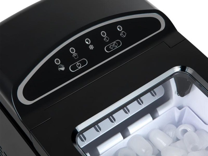 Po zapnutí spotřebiče, stačí zvolit velikost kostek ledu a to je vše, co musíte udělat. Pak už stačí jenom sledovat nastavení na LED panelu. Chod je znázorněn přehlednými obrázkovými ikonami, které upozorní například na to, že je proces u konce a zásobník je plný. Pomocí ikony budete také upozorněni na absenci vody v zásobníku.