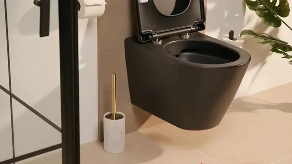 WC souprava Marmel zaujme elegantní kombinací zlatého odstínu a mramorového dekoru. Je volně stojící, vyrobená z odolné polypryskyřice a vybavená pevnou toaletní štětkou s průměrem 9 cm.