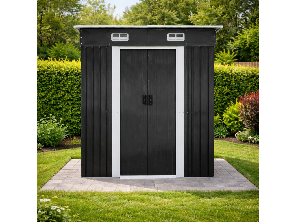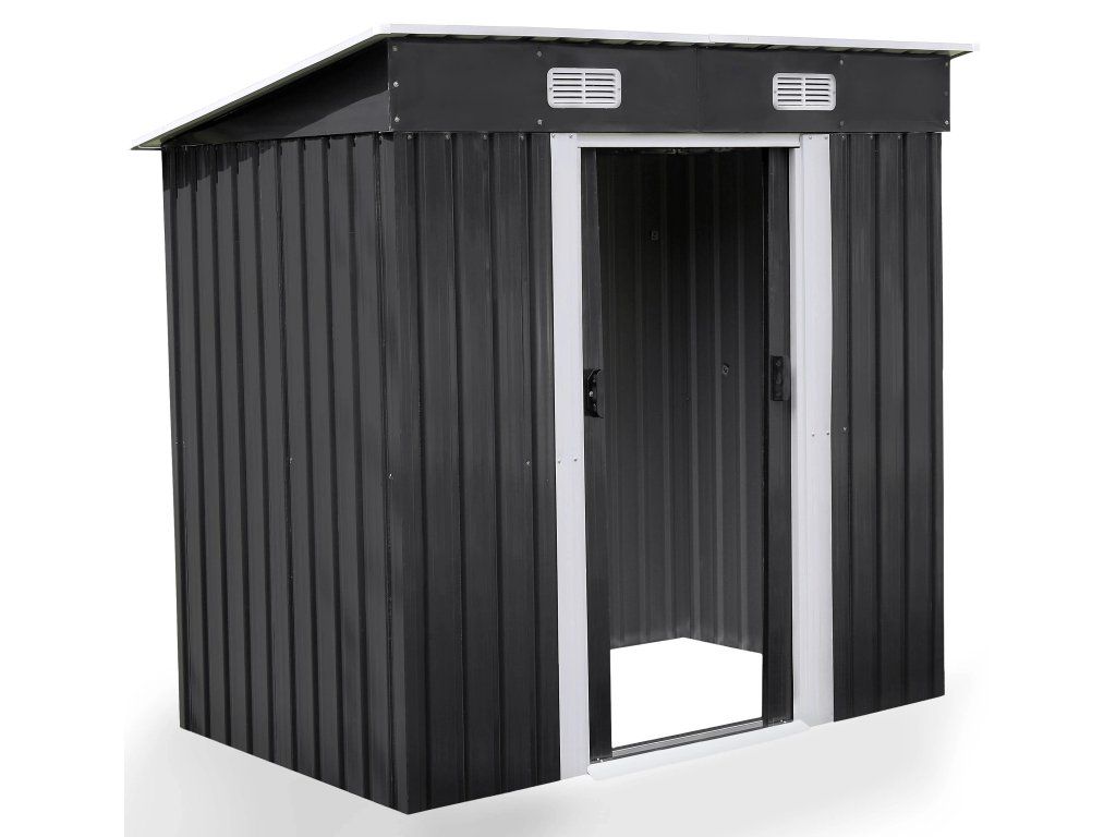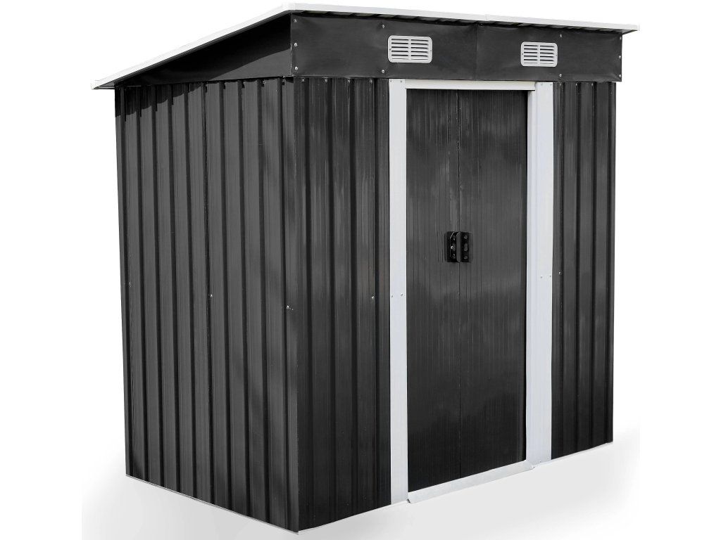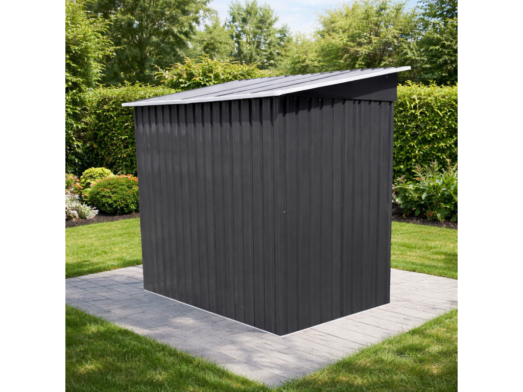 Moderní design s praktickou pultovou střechouKovový zahradní domek v antracitovo-bílém provedení působí elegantně a zároveň technicky čistě. Díky pultové střeše je zajištěn efektivní odvod vody a sněhu.