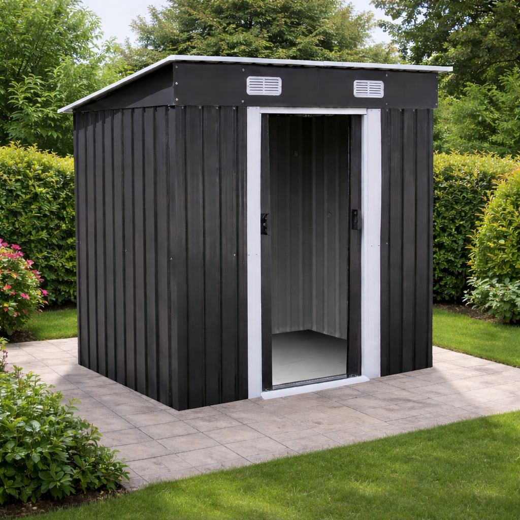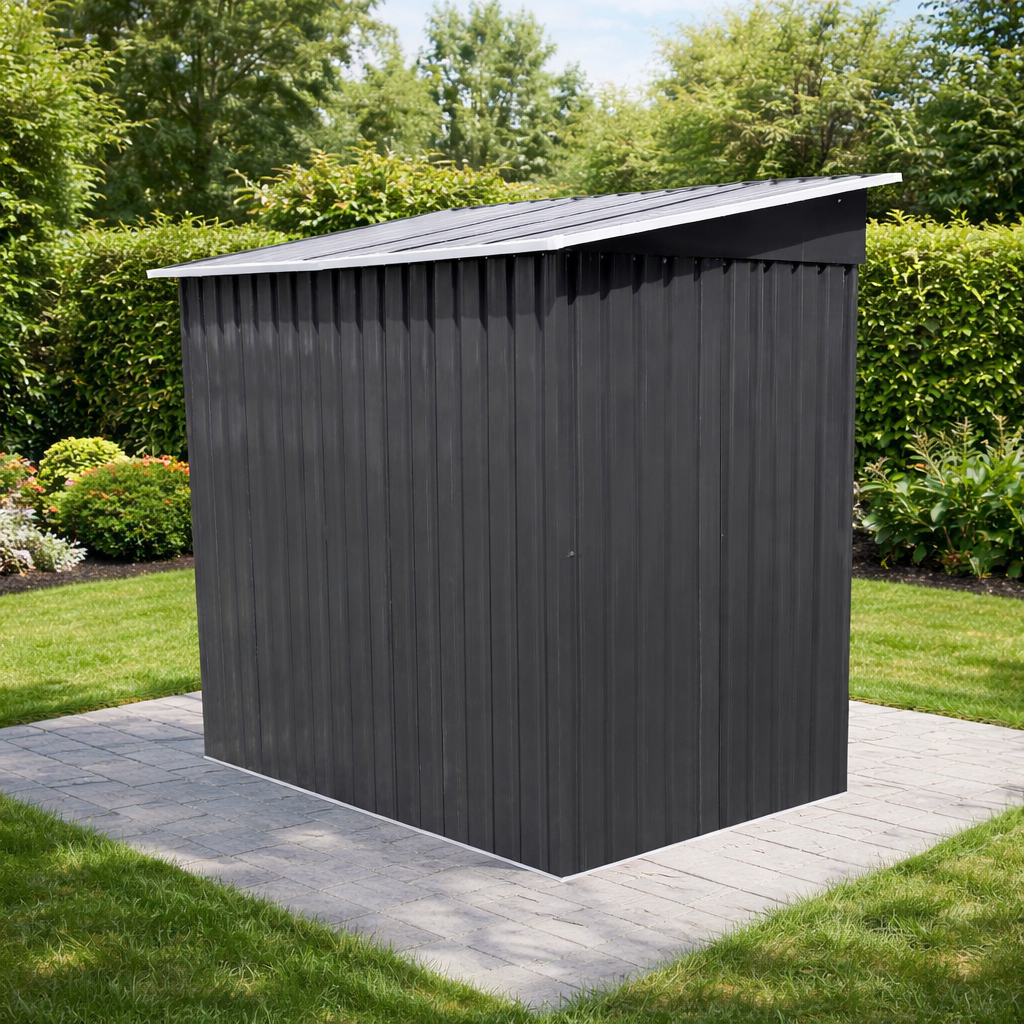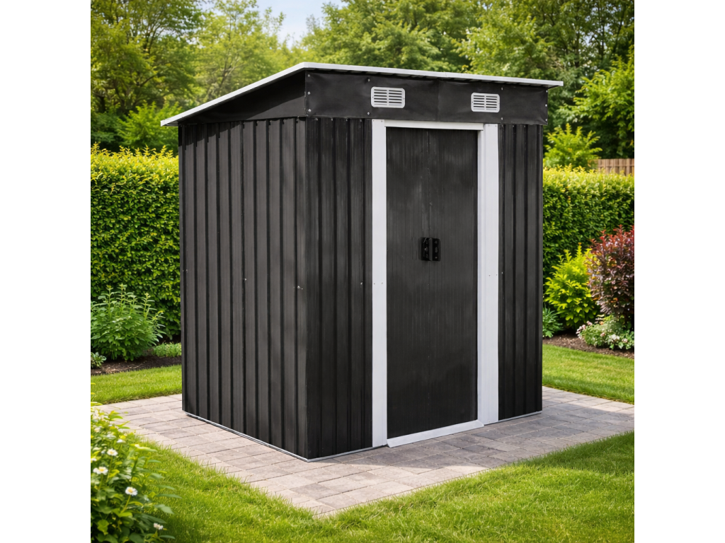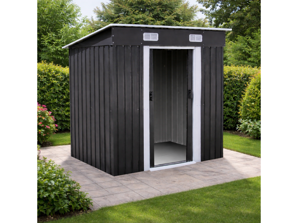 Moderní design s praktickou pultovou střechouKovový zahradní domek v antracitovo-bílém provedení působí elegantně a zároveň technicky čistě. Díky pultové střeše je zajištěn efektivní odvod vody a sněhu.