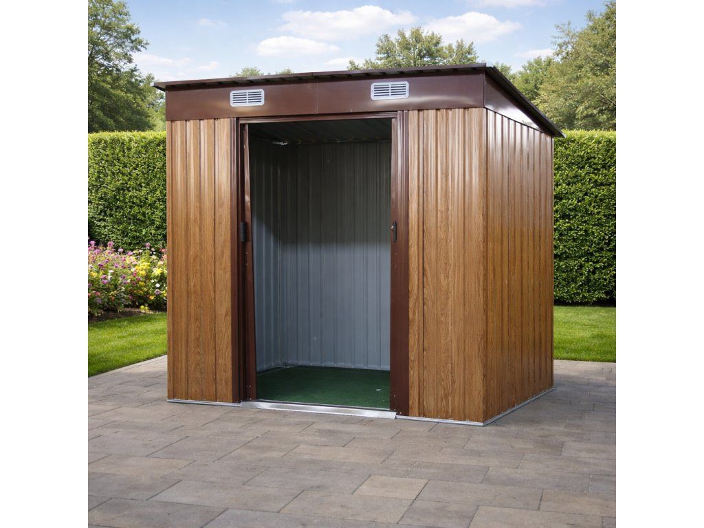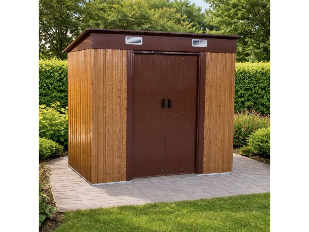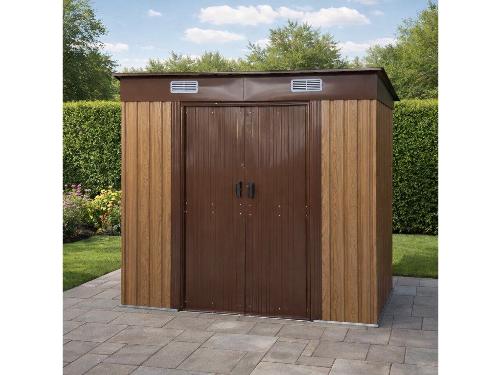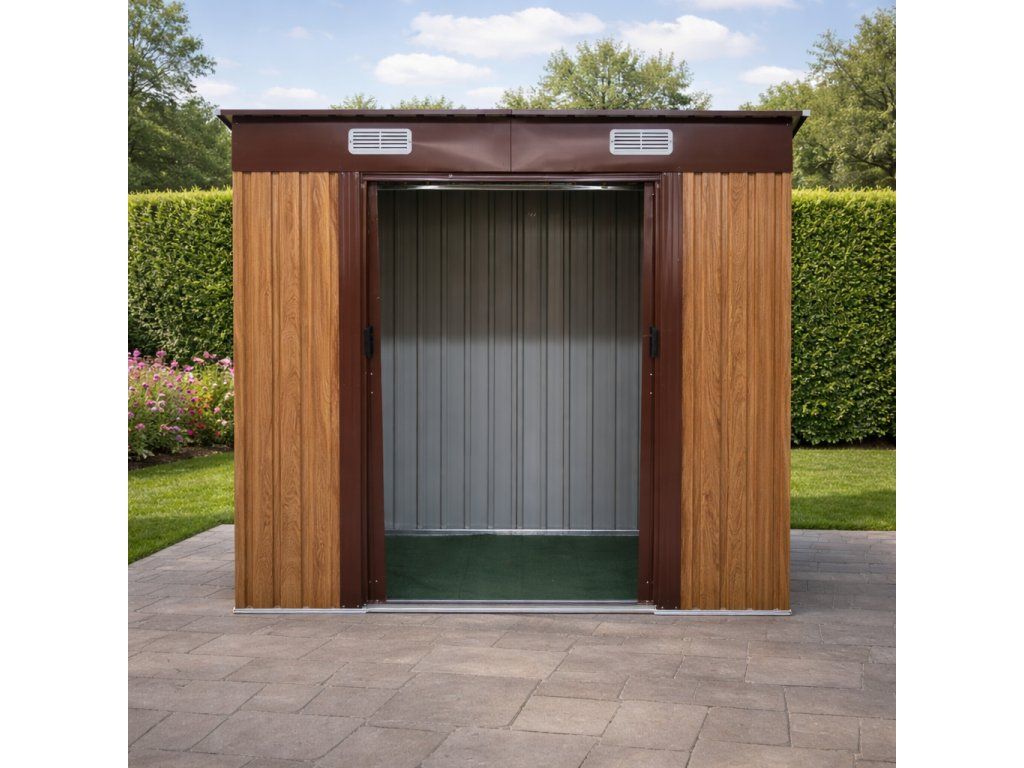 Odolná ocelová konstrukceKonstrukce je vyrobena z pozinkované oceli o síle 0,6 mm, která zajišťuje stabilitu a dlouhou životnost. Opláštění tvoří lakovaný pozinkovaný ocelový plech o síle 0,25 mm. Pozinkování chrání materiál proti korozi a zajišťuje odolnost vůči vlhkosti i nepříznivým povětrnostním podmínkám. Robustní rám zvyšuje celkovou pevnost stavby. TIP: Pro maximální stabilitu doporučujeme domek umístit na rovný a zpevněný podklad.
